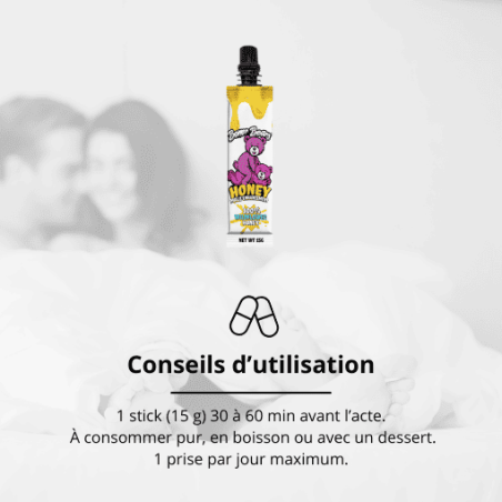 Offrez un coup de boost naturel à vos performances avec le Sex Honey Boner Bears, un miel aphrodisiaque à base de miel brut de fleurs sauvages et de plantes stimulantes comme le ginseng rouge, le tribulus et le ginkgo biloba. Facile à consommer, ce stick de 15g vous accompagne en toute discrétion et vous prépare à des moments d’intimité plus intenses. Idéal pour retrouver énergie, endurance et confiance au lit, naturellement. À consommer 30 à 60 minutes avant l’acte pour un effet optimal.