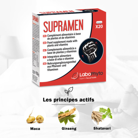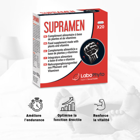 Prenez 2 gélules de Supramen une heure avant vos rapports sexuels. Ses effets rapides vous garantissent des résultats optimaux en toute simplicité. Supramen est déconseillé aux enfants, adolescents et aux personnes sous traitement antihypertenseur ou antidiabétique. Pour prolonger vos performances, pensez également aux gélules MaxiControl.