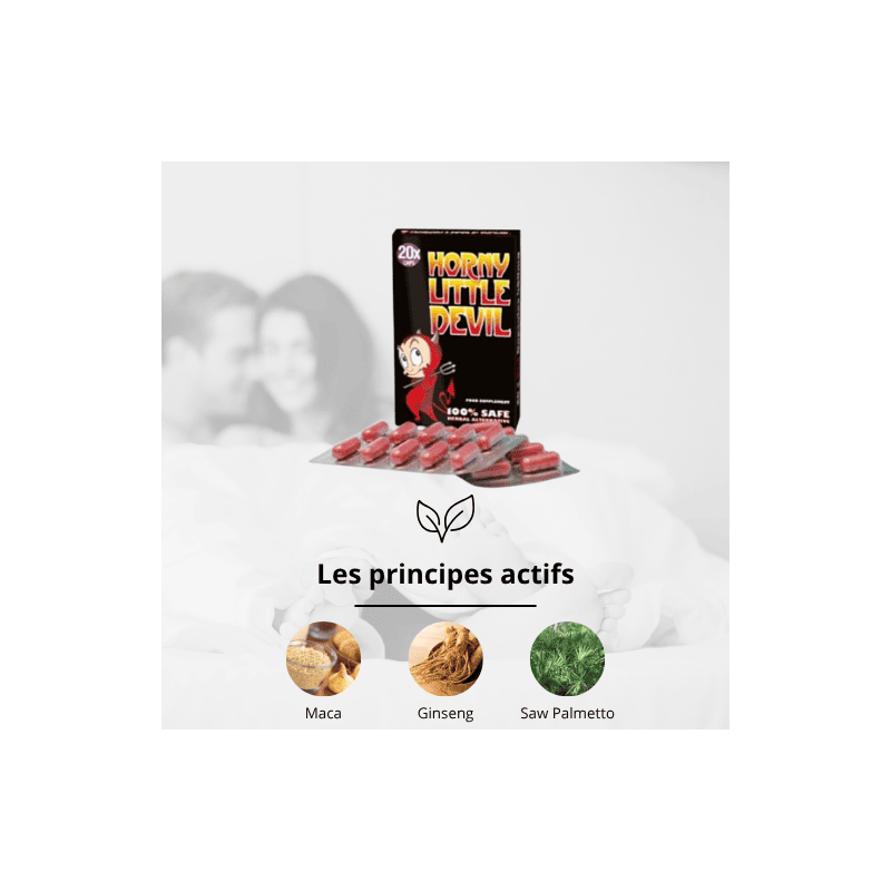 Horny Little Devil est un aphrodisiaque permettant à l'homme d'obtenir une érection forte environ 20 à 40 minutes. Il rend vos rapports plus intenses et agréables, autant pour vous que pour votre partenaire. Les ingrédients favorise une absorption rapide dans le sang, d'où l'effet rapide et durable du produit.