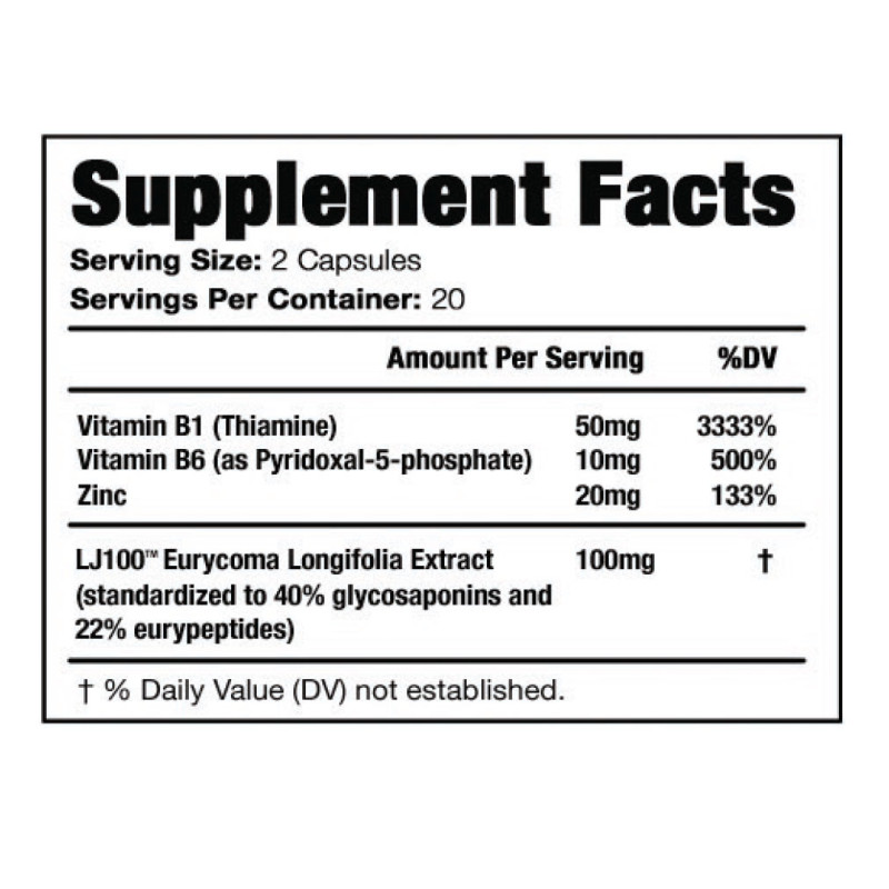 100 mg de Tongkat Ali LJ100 50 mg de Vitamine B1 10 mg de Vitamine B6 20 mg de Zinc